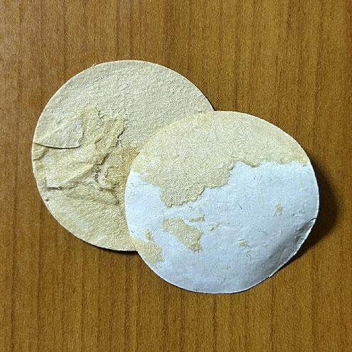 | 偽物はインクジェットプリンターでシールラベルに印刷した物 牛乳キャップを長年触っている経験上の感触から印刷面に違和感を感じました。既に60年以上経過しているキャップにしては硬質感がありません。年数を重ねたキャップは独特の硬質感(長年の乾燥による)があり、平成以降のキャップでは出せない感触です。一方、裏面を見る限りある程度年数の経ったキャップのようです。しかしながら、よくキャップを見ると印刷面の上面だけ紙が白い(紙の断面)気がします。 そこで、私が手の油やコーヒーの付着など汚れが経年で浮いてきたキャップを洗浄する液(薄めたキッチン漂白剤)に漬けてみたところ、一瞬にして印刷面が変色・脱色し、インクジェットプリンターの印刷物であることが判明しました。 通常、印刷機で印刷されている本物の牛乳キャップは、洗浄液に漬けても直ぐに変色・脱色することはありません。次に一番上の怪しい白い紙をゆっくり剥がしてみたところ、粘着力もしっかり残っているシールラベルでした。左の写真が洗浄液に漬けて3秒で変色・脱色した印刷面、右が剥がしたシールの裏面。ここまで見せれば偽物であることが誰にでも分かると思います。おそらくシールラベルの粘着剤が新しかったので、ごく最近作られた偽物だと思われます。もし、これが風合いがあるビンテージの紙にインクジェットで印刷し、糊で接着されていたら更に見た目では判別つかないでしょう。 これは私の予想になりますが、使用済のキャップをベースに使ったのも、古い未使用キャップ(価値がある)の上面だけ剥がす勇気がなく、安く手に入れた価値のないキャップの上面だけ剥いでシールラベルを貼ったのでしょう。よくよく見れば裏面にはビンに装着されていた独特の折り目が見えますが、印刷面にはその折れ目がありませんね。通常ならビンに装着されていた時の痕跡が表面にも必ず出ます。 どのようにして製造したのか? 見た目だけでは真贋判定が難しい偽物を製作するには本物の画像データが必要です。そこでピン!と頭に閃きました。 閃いた先は某オークションです。このオークションでビンテージキャップ(過去に高額で落札された物)のスキャン画像を販売している方が居られます。私もこの方から本物のキャップを数枚落札させていただきましたが、この方は実際に画像のレアキャップを所有(オークションで実物は既に売ったかもしれない)しており、販売されている画像は本物からのスキャン画像と思われます。このスキャン画像のプリントを安価(数百円)で落札し、それを再度スキャンして画像データ化すれば、出品上の紹介写真では真贋判定ができない偽物の製作は容易です。 そこで、この方が販売されている複数のスキャン画像セットを確認したところ、偽物と同じキャップが入っているセットがありました。おまけに、某フリマで同じ時期に同じ出品者から販売された別のビンテージキャップ(愛知県の曜日入りキャップ)も同じスキャン画像セットに入っていました。曜日やキズの位置など(印刷後に別途何らかの方法で汚れを更にウェザリングしている)も一致していることから、このスキャン画像データを使った偽物が流通した可能性があります。思えば今は削除されていますが、別のスキャンデータ画像セットに入っているビンテージキャップも最近複数出品されていました。 もし、該当するキャップを最近購入された方、もう一度よく確かめてみてください。不安なら水に浸せばインクジェットプリンターのインクなら変色やインクの滲みが出るので判定(少量キッチン漂白剤を水に混ぜたら効果抜群です)できます。 個人が観賞用に偽物を製作するのは自由ですが、偽物である表記をせずに流通させるのは大問題というか詐欺です。今回は授業料と記事ネタ代として出品者や某フリマに返金を要求する気はありませんが、この記事を読んで最近某フリマで曜日入りのビンテージキャップを相場より安く購入した方は確かめた方が良いと思います。 |